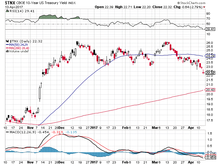 If the bond market is any predictor of what lies ahead, it would suggest the nervous and cautious tone brought about by recent events is not just geopolitics, but some legitimate apprehension as to what the domestic economic output will look like without all the stimulus promises from the “Trump trade.” The yield on the 10-year Treasury plumbed a fresh five-month low last Friday after Trump talked down the dollar and interest rates while at the same time, in an apparent reversal, said Federal Reserve Chair Janet Yellen was “not toast” in leading the central bank when her term ends next year.