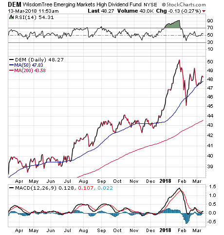 DEM has produced a total return of 27.24 percent during the past 12 months, as of March 12, compared to 22.46 percent for the MSCI ACWI Ex USA NR index, which tracks large- and mid-capitalization non-U.S. equities, 17.30 percent for the S&P 500 and 20.45 percent for the Dow Jones Industrial Average. The fund’s share price also has shown recent momentum by rising 68 cents a share, up 1.43 percent, on Friday, March 9, to close at $48.30, before climbing 10 cents a share, or 0.21 percent, to $48.40, on Monday, March 12.