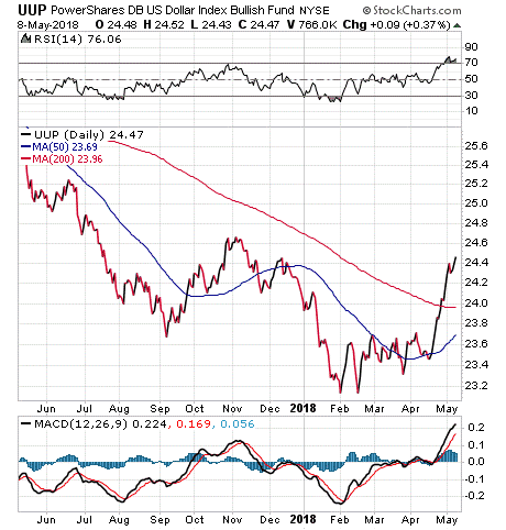 The PowerShares DB US Dollar Index Bullish Fund (NYSE:UUP) is an ETF that allows investors to gain exposure to the U.S. dollar without engaging directly in foreign exchange accounts. A key question is whether the recent rise in the value of the U.S. dollar is sustainable as a long-term trend or if it is a short-term opportunity that may be best suited for traders seeking to seize quick profits.