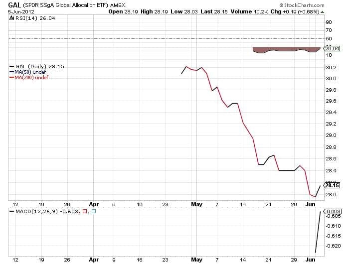 As of June 5, GAL’s top five holdings were: SPDR S&P 500 ETF (SPY), 22.90%; SPDR S&P World EX-US ETF (GWL), 15.47%; SPDR Barclays Capital High Yield Bond ETF (JNK), 11.05%; SPDR Barclays Capital Intermediate Term Corporate Bond ETF (ITR), 8.34%; and SPDR S&P Emerging Markets ETF (GGM), 7.73%.
