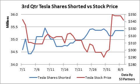 The year-to-date, mark-to-market loss for Tesla short sellers though Aug. 6 reached $1.71 billion, down 16.03 percent for the year, according to S3 Partners. Of that loss, $1.54 billion of the plunge for short sellers occurred since Tesla’s Aug. 1 earnings announcement. The short sellers actually trimmed their losses by $218 million on Aug. 6, when Tesla’s share price dipped 1.78 percent to the trading day at $341.99.