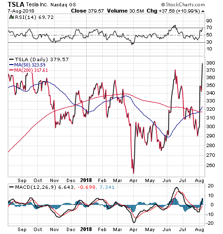 Tesla should gain a boost from the U.S. economy, which produced a 4.1 percent jump in gross domestic product during the second quarter of 2018, compared to the same quarter of 2017. But third-quarter gross domestic product (GDP) and corporate earnings should be “just as robust,” predicted Bryan Perry in his Cash Machine advisory service. With such sustainable momentum, a trade war and “toxic politics” will only serve as “speed bumps,” he added.