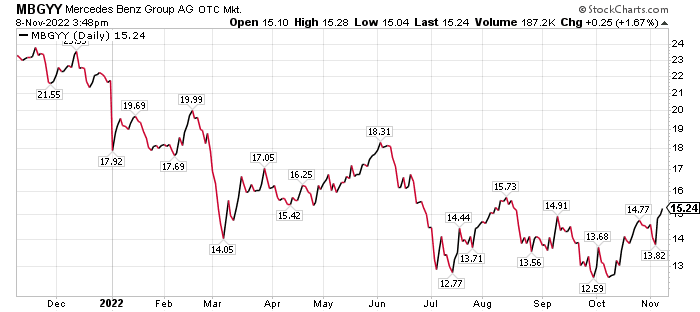 Mercedes-Benz is one of the world’s preeminent luxury car companies and sells vehicles in almost every country, Skousen wrote to his Home Run Trader subscribers. The company also offers financing, leasing, car subscriptions, fleet management, digital services and insurance brokerage options.