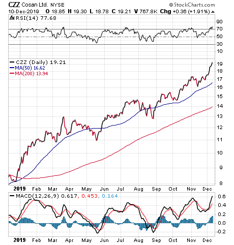 “One stock that hits all my marks is Cosan Ltd. (NYSE:CZZ),” Woods told me. “The Brazilian energy producer specializes in biofuels, including ethanol, gasoline, diesel fuel. What I like most about CZZ is its tremendous earnings growth. Last quarter, earnings per share grew by 833% year over year. Over the past three years, earnings are growing at an annual rate of 72%. Now that is some serious profit fuel.”