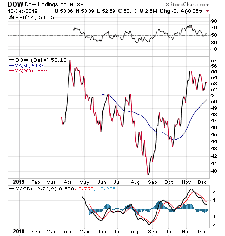 “Two names come to mind for where I see opportunities,” Perry said. “Dow Inc. (NYSE:DOW) was split from DuPont earlier this year, is a member of the Dow Jones and trades at its initial $53 spin-off price. The stock pays a handsome 5.3% dividend yield and just posted earnings of $0.91 versus $0.73 estimate, a 24.3% upside surprise and the company gave upbeat forward guidance.”