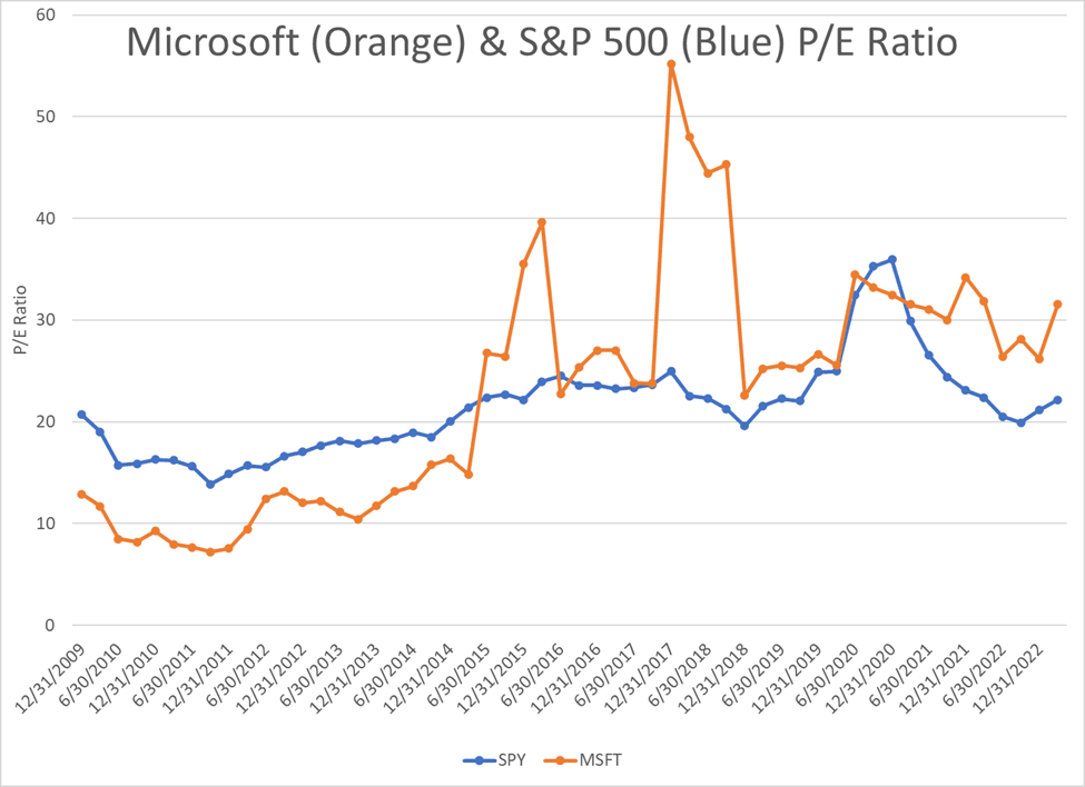 Let’s look at the P/E ratio for Microsoft and the S&P 500 over time.