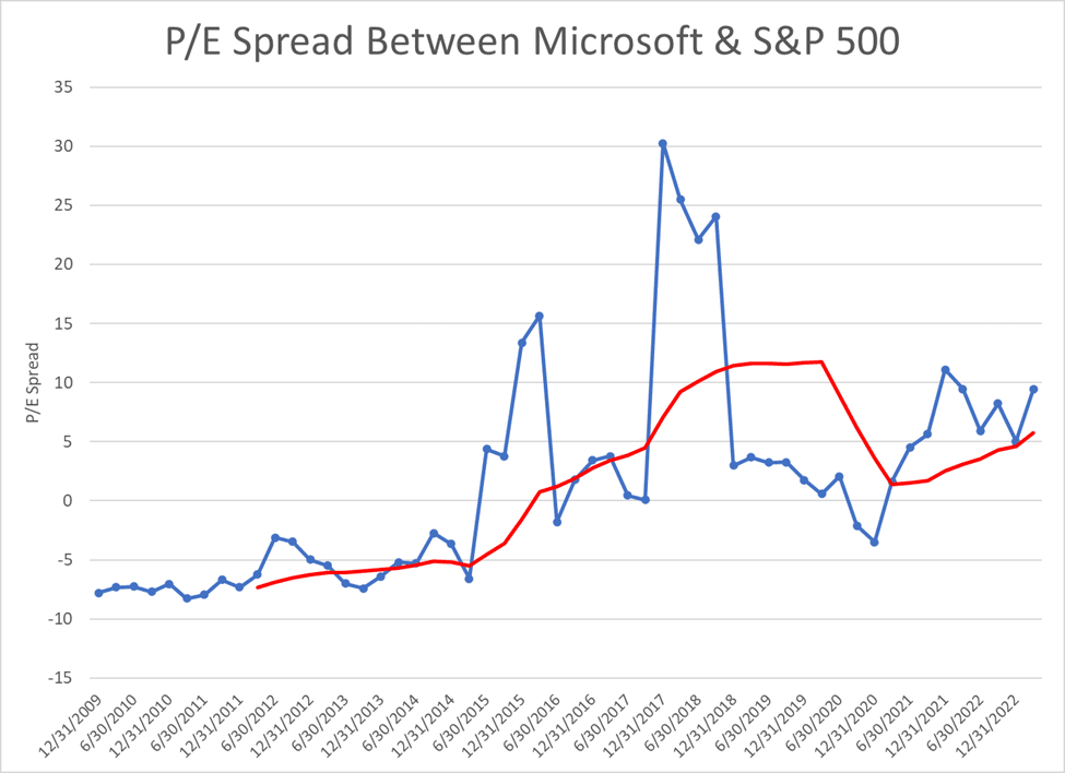 The spread between the P/E ratio for Microsoft and the S&P 500 widened and closed within a year.