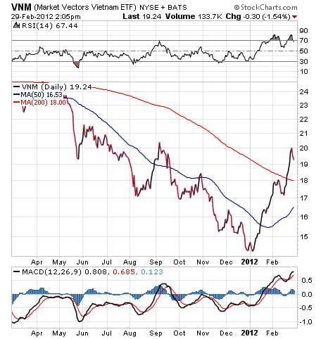 With trade relations on the rise in Vietnam, its Asian neighbors are looking to set up operations there. Japanese companies may start investing to build factories in Vietnam, after a recent flooding disaster in Thailand exposed a dramatic need to diversify manufacturing operations. The following chart of the fund’s performance for the past year shows investors now are recognizing its promise. In recent pricing, VNM closed at $19.99 on Feb. 27, marking its highest point since the fund reached $20.10 back in September of last year.