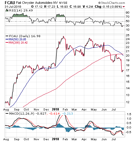 The company’s stock has fallen in recent weeks, but the retreat may offer a buying opportunity to investors who still believe in the value of brands such as Jeep, Ram and Maserati, as well as the five-year strategic plan forged by Marchionne and Manley. Its 12-month stock chart shows the stock is trading well off its 2018 highs.