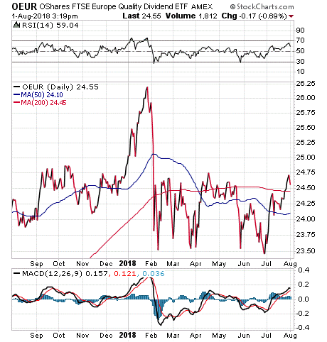OEUR reached its all-time high of $26.90 on January 30, 2018, only to fall more than 10% in the week that followed. Since then, OEUR has traded in a pretty tight range of $23 to $24 per share. However, the fund’s share price rose above both its 50 and 200-day moving averages in July, as can be seen in the chart below: