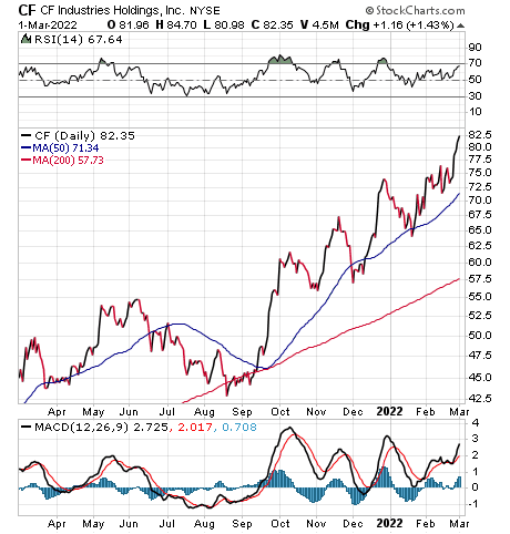 Wheat, corn and soybean prices jumped upon the full revelation of the Russian attack of Ukraine, Perry continued. One of the big winners from pure demand and sanctions will be CF Industries Holdings, Inc. (NYSE: CF), a manufacturer and distributor of agricultural fertilizers, including ammonia. The company, based in Deerfield, Illinois, a suburb of Chicago, is facing increased distribution costs, particularly for transportation.