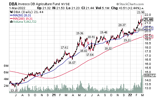 Despite the horrors of war, investors have a chance to profit from the surge in agriculture prices and other commodities through the futures markets. Instead of buying futures directly, investors can invest in a diversified agriculture commodities through Invesco DB Agriculture (DBA), an exchange-traded fund, said Bob Carlson, a pension fund chairman who also leads the Retirement Watch investment newsletter.