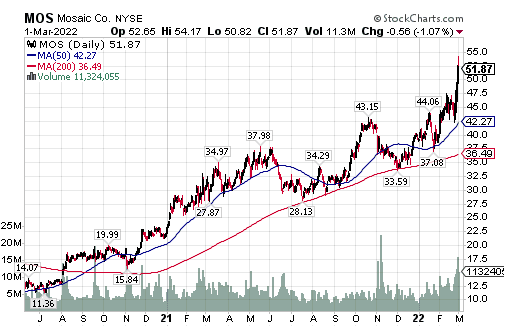 The company’s year-over-year earnings per share (EPS) growth jumped about 242%. That report, along with the price pressure in the industry from constricted supply out of Russia, has resulted in a big surge in the value of MOS call options that recently were recommended by Jim Woods in his High Velocity Options service.