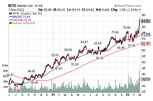 Nutrien Ltd. (NYSE: NTR), a Canadian fertilizer company based in Saskatoon, Saskatchewan, is the largest producer of potash and the third largest producer of nitrogen fertilizer in the world. The company’s interim chief executive Ken Seitz said Nutrien will boost potash production if supply problems worsen in Russia and Belarus, the world’s second- and third-largest potash-producing countries after Canada.