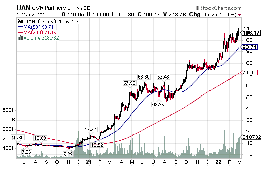 CVR Partners LP (NYSE: UAN), of Sugar Land, Texas, manufactures and provides nitrogen fertilizer products as a subsidiary of Coffeyville Resources, a unit of CVR Energy Inc. UAN is another recommendation of Perry, who especially likes its 9.1% dividend yield that should interest income seekers.