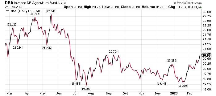 Top holdings and percentages of the fund, as of Feb. 17, were sugar, 13.4%; live cattle, 12.63%; coffee, 12.23%; soybeans, 12.16%; corn, 11.77%; cocoa, 11.68%; and wheat, 11.29%. The fund’s total expense ratio is 0.91%, but its share price has risen 2.63% so far in 2023 through the market’s close on Feb. 17.