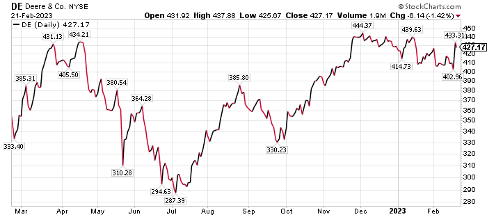 Skousen recommended Deere & Co. in January to his Five Star Trader subscribers and set a protective stop. For those willing to take increased risk to pursue significantly enlarged potential profits, Skousen also recommended specific call options in Deere, which can ascend much faster than the stock price.