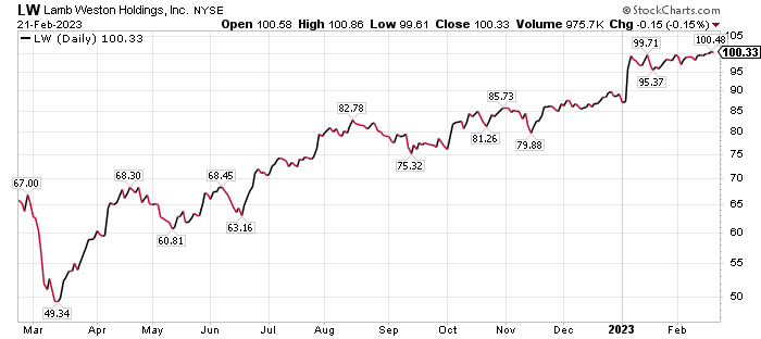 Bryan Perry, the leader of the Cash Machine investment newsletter and the Breakout Options Alert trading service, recommended Lamb Weston call options in the latter, options-only service. The related stock has jumped 12.59% so far this year, as of the close on Feb. 21.