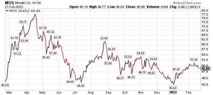 BofA chose Mosaic for a place among 11 top stocks aligned with its 2023 themes that include quality, value, free cash flow generation, domestic vs. global exposure and dividend growth potential. The list also targets stocks that show earnings resilience given the expected recession. The investment firm seeks either top-down strength and/or margin stability.