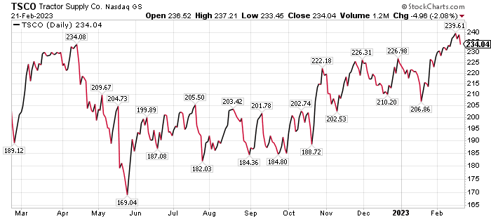 Tractor Supply Co. (NASDAQ: TSCO), of Brentwood, Tennessee, sells products for agriculture, lawn and garden maintenance, home improvement, livestock, equine and pet care for recreational farmers and ranchers, pet owners and landowners. The stock received a buy recommendation and a $260 price objective from BofA Global Research, which wrote a research note late last month listing TSCO as one of 11 top buys for investors in 2023. TSCO was the one and only pick for the list from the consumer discretionary sector.