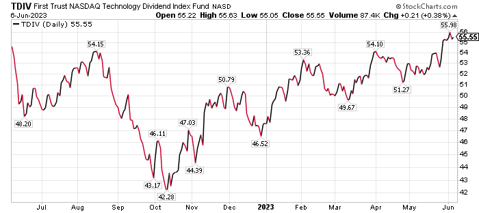 A broader-based fund with a decent dividend yield is First Trust NASDAQ Technology Dividend Index (TDIV). The ETF tries to track the Nasdaq Technology Dividend Index, which is composed of technology and telecommunications companies.