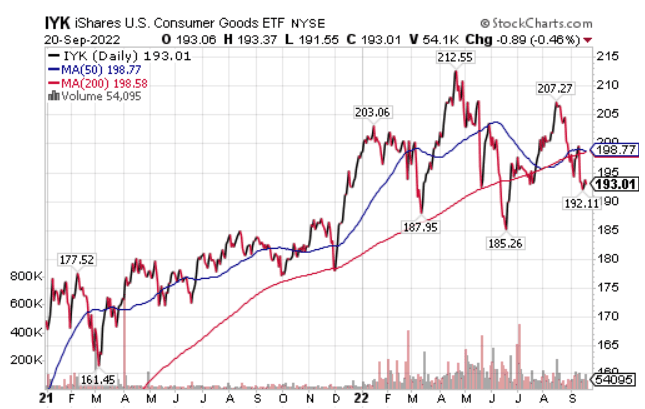 A good way to establish a diversified consumer staples portfolio is through an exchange-traded fund (ETF), Carlson counseled. He suggested iShares U.S. Consumer Staples ETF (IYK).