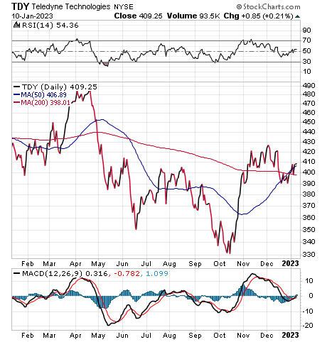 Teledyne Technologies Incorporated (NYSE:TDY), of Thousand Oaks, California, also is one of five defense investments on the rise amid Russian’s invasion of Ukraine. One of the company’s business units gained an award for 500 additional robots requested by the U.S. Army and Navy.