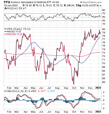 The five defense investments’ rise is boosted by President Biden signing legislation to give the U.S. Department of Defense (DoD) $797.7 billion in discretionary spending for fiscal year 2023, up $69.3 billion, or 9.5%, compared to fiscal year 2022. The amount appropriated topped the president’s budget request by $36.1 billion.