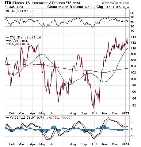 ITA follows the Dow Jones U.S. Select Aerospace & Defense Index. Its top holdings recently were Raytheon, Lockheed Martin, Boeing, TransDigm (NYSE: TDG) and Northrop Grumman. It held 35 stocks, and the top 10 holdings of the ETF comprised 75% of the portfolio.