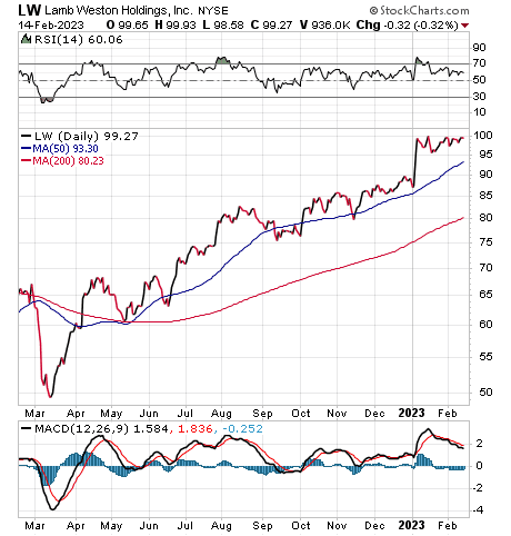 Bryan Perry, the leader of the Cash Machine investment newsletter and the Breakout Options Alert trading service, recommended Lamb Weston call options in the latter service. The stock is up 11.76% so far this year, as of the close on Feb. 14.
