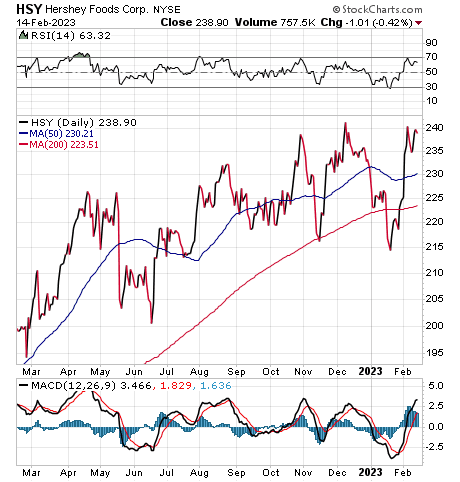 Jim Woods, who leads the Bullseye Stock Trader advisory service and the Intelligence Report investment newsletter, is not currently recommending Hershey but has done so in the past. Woods features an Income Multipliers portfolio in his newsletter that seeks to identify stocks on the ascent that also pay dividends just like Hershey.