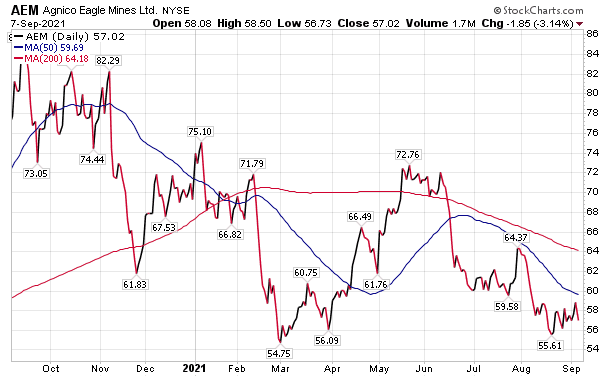 Canada’s Agnico Eagle Mines (NYSE: AEM), of Toronto, Ontario, operates gold mines in Canada, Finland and Mexico, while also pursuing exploration and development activities in the United States. The company gained a place among BoA’s five gold stocks to buy partly due to its expected improvement in second-half 2021 operating performance.