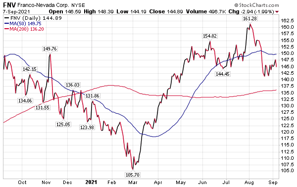 Franco-Nevada (NYSE: FNV), a Toronto, Ontario, Canada-based, gold-focused royalty and streaming company with a diversified portfolio of cash-flow producing assets, benefits from favorable product price tailwinds. The stock also can appreciate amid mergers and acquisitions (M&As) in the gold arena, BoA wrote.