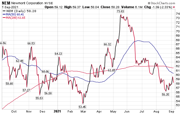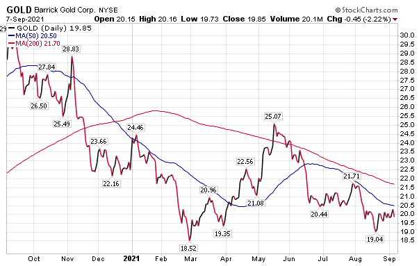 “Although rising inflation and negative real interest rates are good for gold and gold mining stocks, the sector has been volatile and largely stuck in a rather tight trading range,” Woods explained. “The best way to approach owning gold mining stocks is to catch them on an uptrend and ride their often-robust momentum higher. Conversely, being in mining stocks can be very volatile, so you need both a stop loss on any positions and/or a trend-following plan such as the one in my Successful Investing newsletter.”