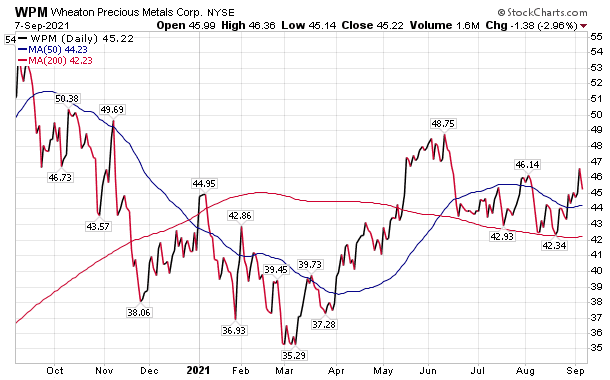 Canada’s Wheaton Precious Metals (NYSE: WPM), of Vancouver, British Columbia, boasts “strong free cash flow funding for its capital allocation priorities in the second half of 2021. BoA’s price objective for Wheaton is $55.00 per share and is based on the stock trading at 2.5x times the investment firm’s estimated net asset value (NAV) for the company.