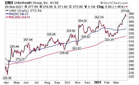 UnitedHealth Group (NYSE:UNH), a Minnetonka, Minnesota-based provider of health care products and insurance services, should hit its stride again by third-quarter 2021, when BoA predicted the company would beat analysts’ expectations and possibly boost long-term growth prospects in 2022. The next run for UNH and its peer MCOs could start in August with “easy” comparisons from a COVID-ravaged 2020, BoA continued.