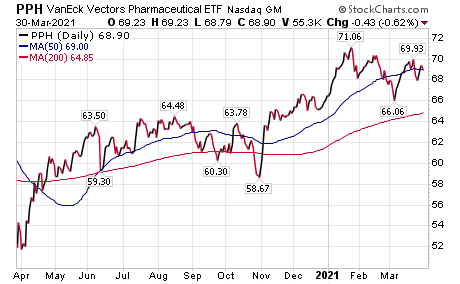 There are two good ETFs to consider: SPDR Select Health Care (XLV) and Van Eck Vectors Pharmaceutical (PPH). The Van Eck ETF is more of a pure play on the sector.