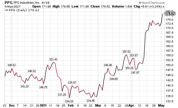 However, PPG aims to gain share from Home Depot’s efforts to grow its paint contractor business. Plus, PPG could be the best value for whatever growth is left in that business after 2020’s work-from-home movement boosted demand for painting projects that can create tough comparisons this year.