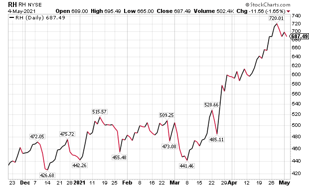 Possible catalysts to let RH top the $650 price objective include continued upside from RH’s gallery conversion strategy, international growth, operating leverage on sales growth, supply chain costs reductions and greater-than-expected share repurchases. Potential problems in reaching that price are a history of execution missteps, weakness in discretionary spending or a recession likely would have an outsized impact on RH’s luxury brand.