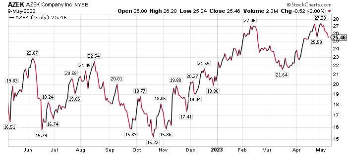 William Blair’s May 5 research note rated AZEK as “outperform” but also forecast that the company’s share price would trade down since it had soared almost 30% so far this year. AZEK’s recently released second-quarter EBITDA beat William Blair’s model by 18% on revenue and margins.