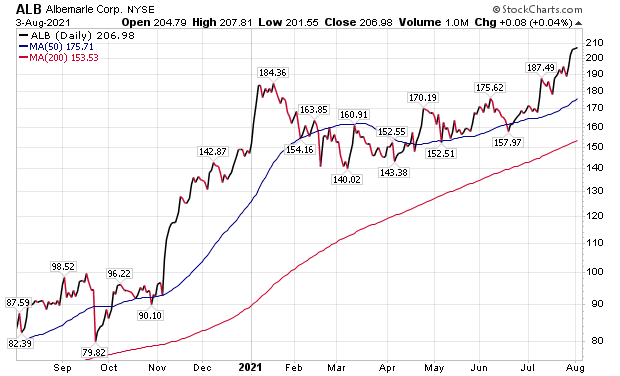 Albemarle (NYSE:ALB) is the world’s largest miner of lithium, which serves as the main ingredient in batteries used by electric vehicles (EVs). As I have written in previous columns, electric vehicle manufacturers such as Palo Alto, California-based Tesla (NASDAQ:TSLA), Detroit-based General Motors (NYSE:GM), Dearborn, Michigan-based Ford (NYSE:F) and Volkswagen AG (FRA:VOW), of Wolfsburg, Germany, appear destined to remain major competitors in the future of ground transportation.