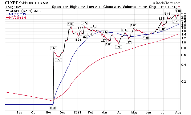 Cybin Inc. (OTCMKTS:CLXPF) is a medical psilocybin molecule maker that is developing a pharmaceutical for veterans who suffer from post-traumatic stress disorder (PTSD), as well as for those who struggle with anxiety, depression and addiction. It began trading publicly in November 2020 and has been on the rise, as shown by its latest stock chart.