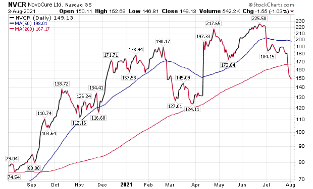 Israel-based Novocure (Nasdaq: NVCR) has a novel therapy for treating solid tumor cancers and jumped more than 162 points, or 274%, from the end of June 2020 to June 2021. It remains a recommendation of Green even though the stock stumbled recently after its Phase 2 trial results to treat advanced liver cancer patients.