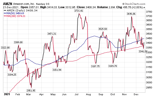 Despite Seattle-based online retailer Amazon.com Inc. (NASDAQ: AMZN) recently receiving a critical letter from Democrats in Congress who claimed the company sacrificed worker safety in pursuit of profits when tornadoes torn apart the company’s warehouse in Edwardsville, Illinois, the company’s prospects still shine. In fact, Amazon is ranked by BofA as the top FANG stock for 2022. One reason is that Amazon unperformed in 2021 and could and could be poised for a bounce back.