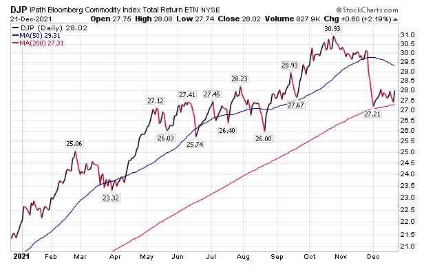 While there are many comparable ETFs and exchange-traded note (ETNs), Carlson recommends the iPath Bloomberg Commodity Total Return (DJP). That ETN is designed to track the performance of the Dow Jones-UBS Commodity Index Total Return.