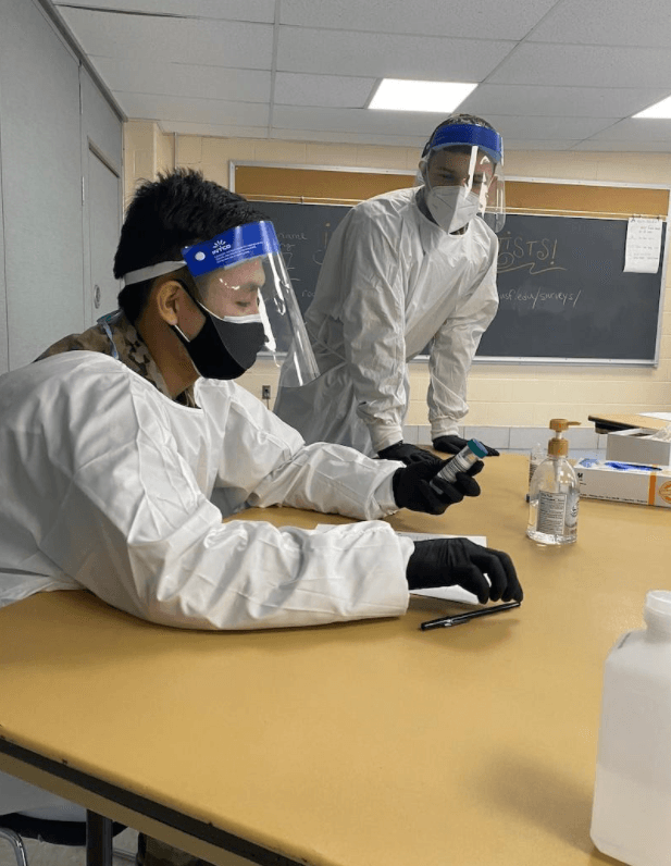 Airman 1st Class Tenzin Dakar, an aerospace medical technician with the 104th Medical Group, and Spc. Michael Major, a unit supply specialist with the 125th Quartermaster Company, help with COVID-19 testing in Massachusetts on Nov. 17.
