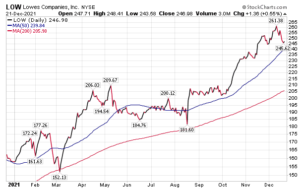 BofA placed a $292 price target on Lowe’s, giving it a 22x 2022 earnings per share estimate. A valuation multiple above the five-year average of 15x is warranted for Lowe’s due to its solid fundamentals and the relatively defensive nature of the home-improvement industry, BofA opined.
