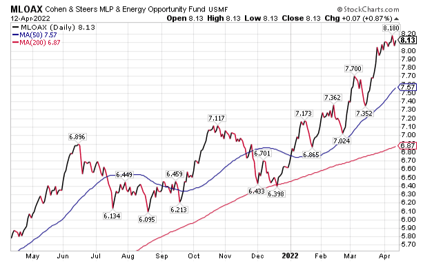 A diversified way to invest in the growing demand for LNG energy is Cohen & Steers MLP & Energy Opportunity Fund (MLOAX). This open-end mutual fund invests primarily in energy master limited partnerships and in former partnerships that have converted to corporations. These “leading” energy service companies provide total returns, aided by current income and price appreciation, through investments in energy-related master limited partnerships (MLPs) and securities of industry companies. Those businesses are expected to derive at least 50% of their revenues or operating income from exploration, production, gathering, transportation, processing, storage, refining, distribution or marketing of natural gas, crude oil and other energy resources.