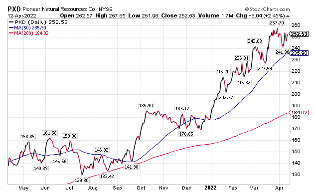 In addition, Pioneer Natural Resources has produced an earnings yield of 3.25%, an adjusted cash earnings yield of 7.48% and a five-year average return on equity of 6.61%, Connell said. At the end of 2021, Pioneer Natural Resources had compiled 2.22 billion barrels of oil equivalent, with 44% of its proved reserves from petroleum, 30% natural gas liquid and 16% natural gas. Connell set a 12- to 18-month price target for the company of 35-40% upside from current levels.