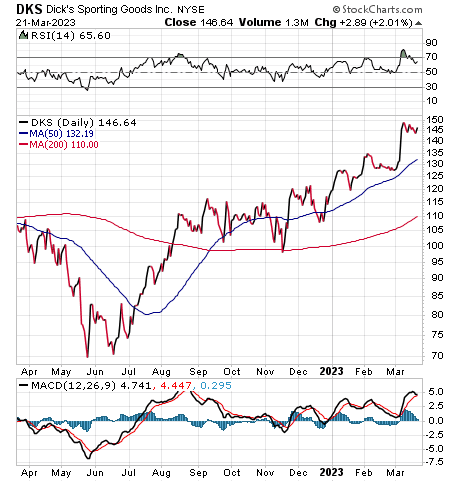 Dick’s Sporting Goods (NYSE: DKS), based in Coraopolis, Pennsylvania, recently received a buy rating and a $170 price objective from BofA Global Research, in line with the recreation company’s historical average. The stock continues to benefit from the shift to solitary leisure activities, as well as an improving outlook for footwear allocations, BofA wrote in a recent research note.